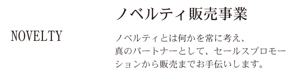 ノベルティ販売においては、お客様の成果こそが私たちの実績であると考え、お客様とともに課題を解決していくパートナーとしての役割を果たす企業を目指しています。マーケットニーズをとらえたオリジナリティに富む製品を提案し、お取引先、消費者に提供してまいります。お客様のニーズに応えるため定期的にヒアリングを行い、消費ニーズのある商品の仕入販売を行っています。セールスプロモーション活動に効果のある物やメディア性に優れた商品を提供し、間接的に企業の売上に貢献します。 |